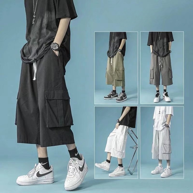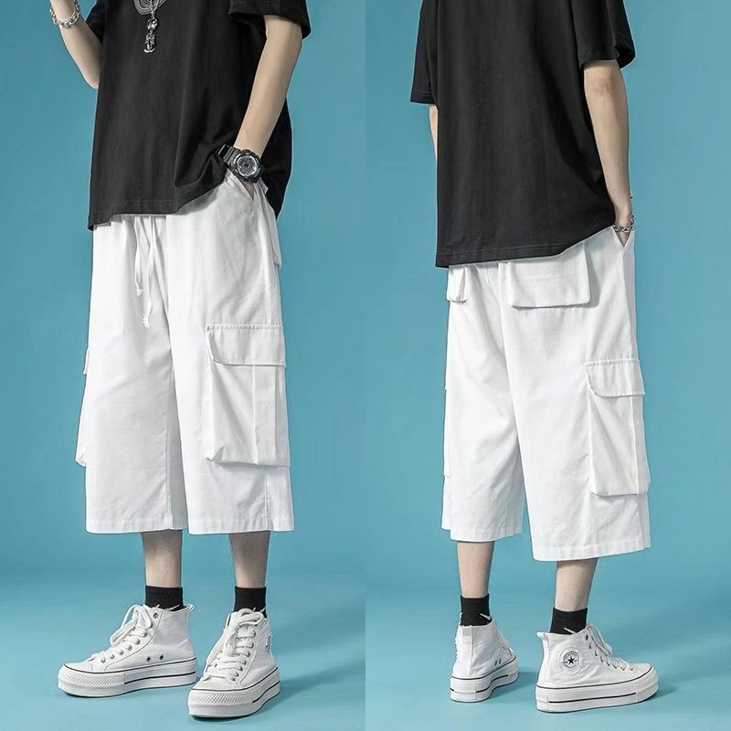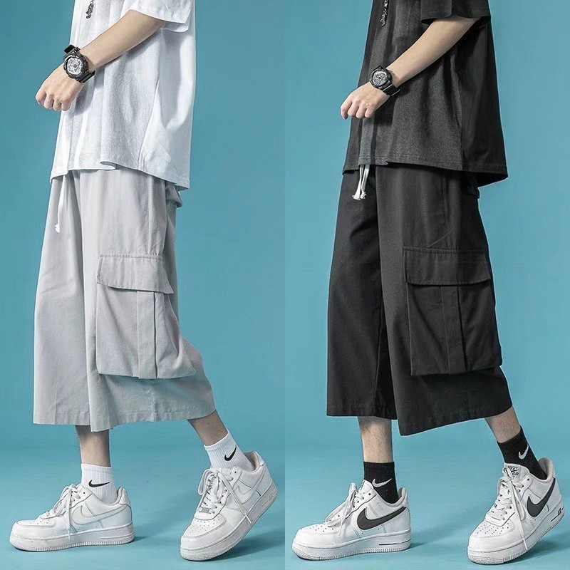 【大口袋】日系潮流寬鬆薄款透氣男士闊腿褲七分褲