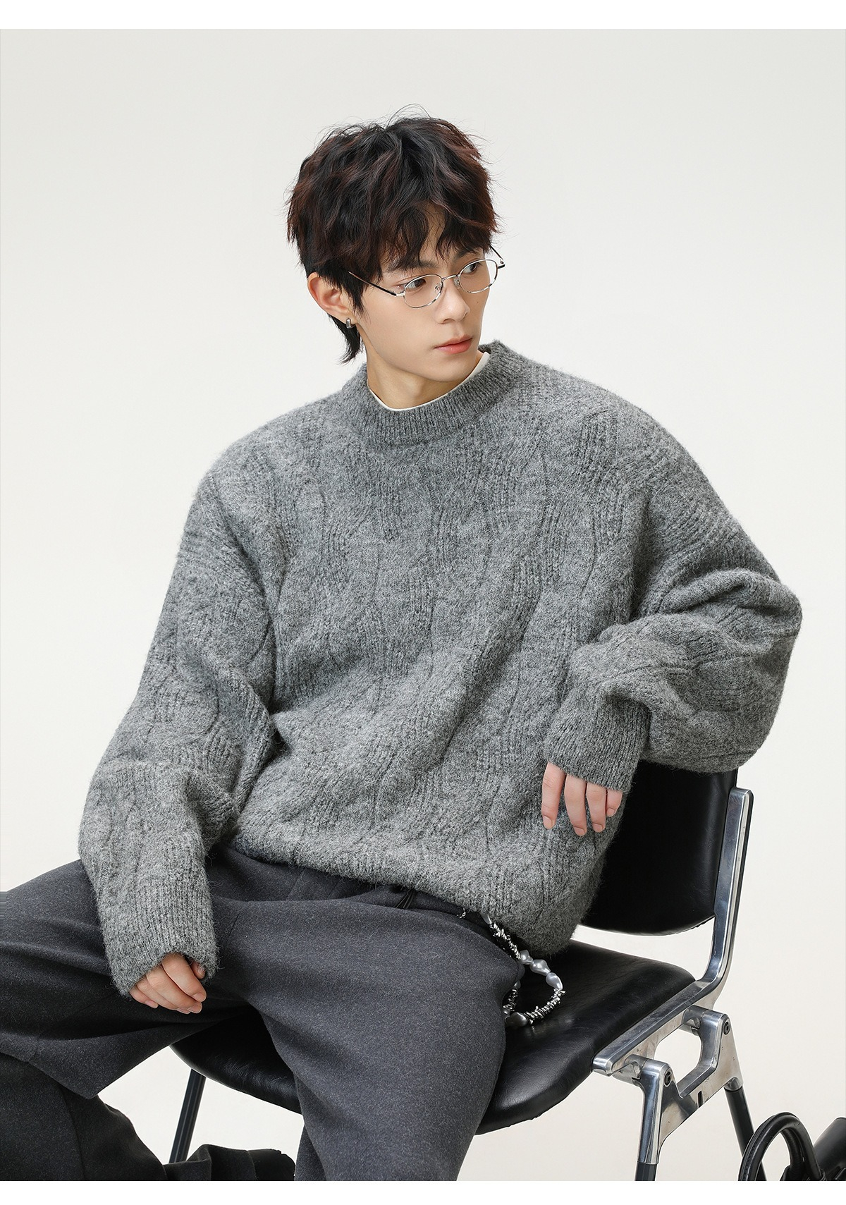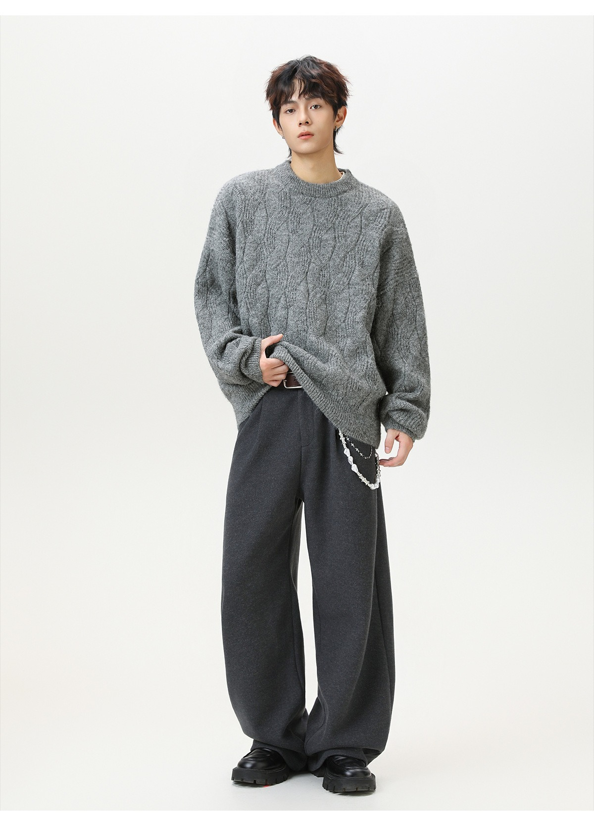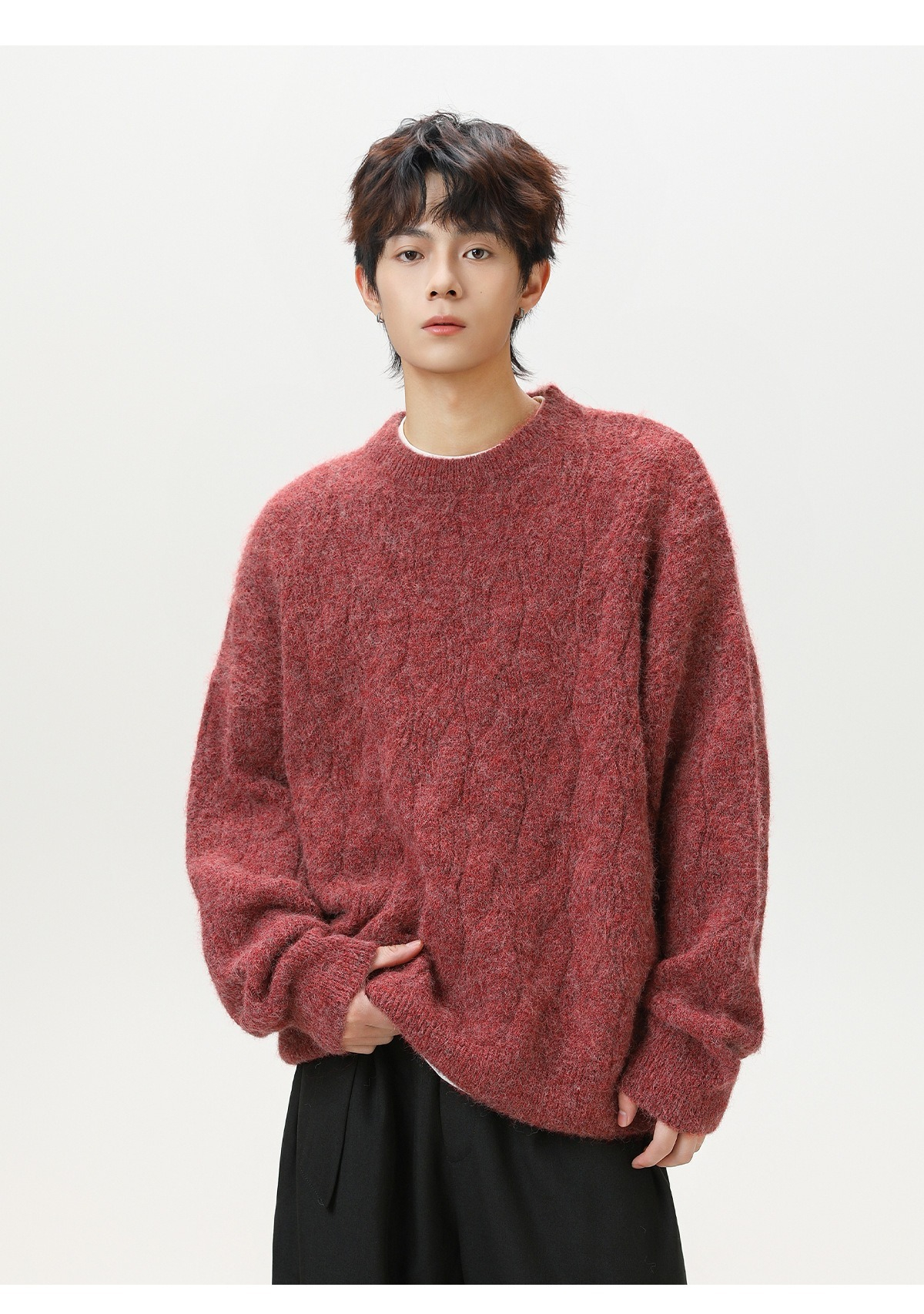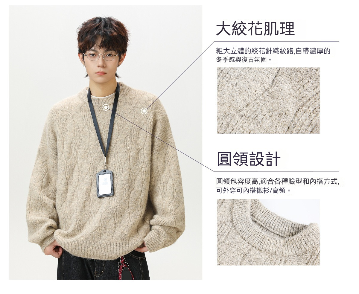 【復古大紋花肌理】秋冬加厚質感純色圓領毛衣寬鬆肌理男士針織衫